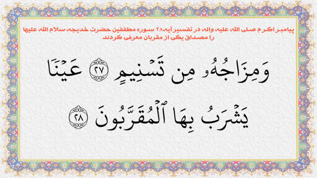 درمیان بانوان دو جهان، در فضیلت و کمال کافی است: مریم، خدیجه، فاطمه و آسیه (علیهن السلام)»(8) پیامبر اکرم (صلی الله علیه واله) در تفسیر (آیه 22 مطففین) «عینا یشرب بها المقربون، همان چشمه بهشتی که مقربان از آن مینوشند.» فرمود:
